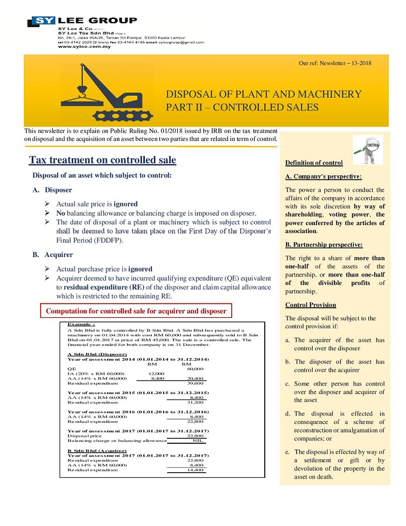 Newsletter-13-2018 - Disposal of plant and machinery - Part II Controlled sales