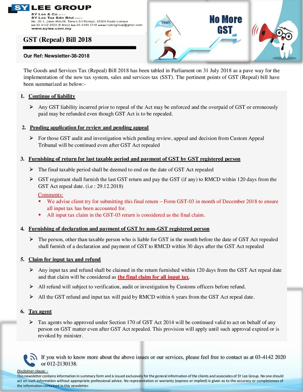 Newsletter-38-2018 - GST (Repeal) Bill 2018