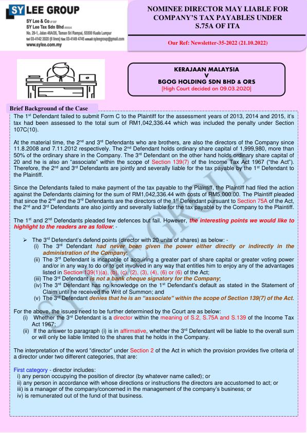 Newsletter-35-2022 - Nominee Director May Liable for Company_s Tax payables